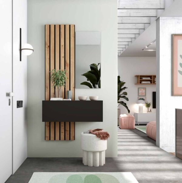 El recibidor 206 mide 90 cm de ancho y estรก acabado en artisan y รฉbano. Incluye mรณdulos Panel TV 47.5×119 cm, Panel TV 47.5×32 cm, Espejo rectangular 40×90 cm, Mรณdulo abatible 90x32x30 cm. Su diseรฑo combina funcionalidad y estilo para tu entrada. Fabricado con materiales de alta calidad.